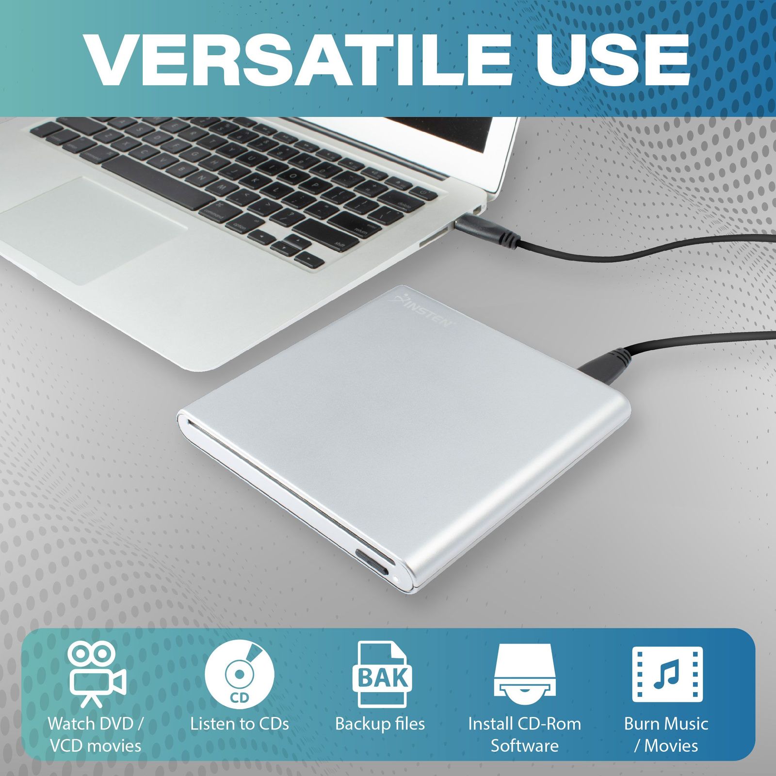 Insten - USB 3.0 External DVD Drive, Slim Portable, Silver, Optical Drive Player CD/DVD+/-RW Writer, 1.6ft Detachable USB Cable, Compatible with PC ...
